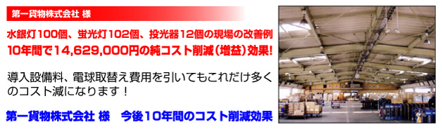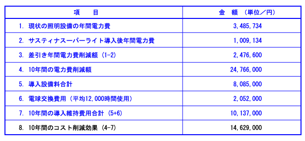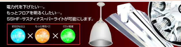 | 弊社の省エネ電灯(「SSHF」「サスティナスーパーライト」)を導入することにより、以下のように大きな節電効果と照明の明るさを得ることができます。導入の参考になさってください。 |